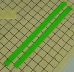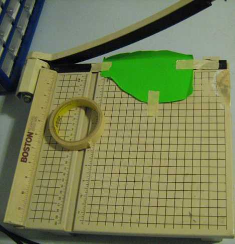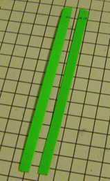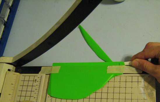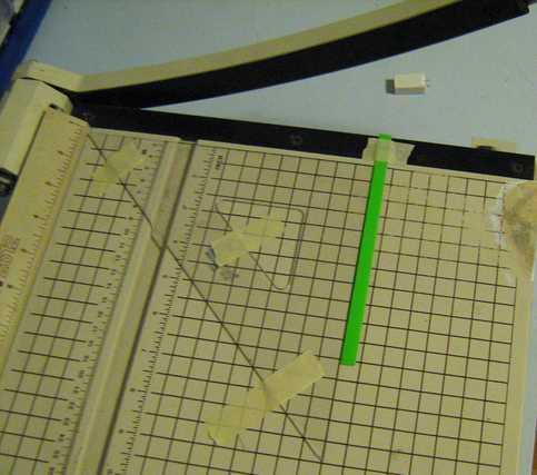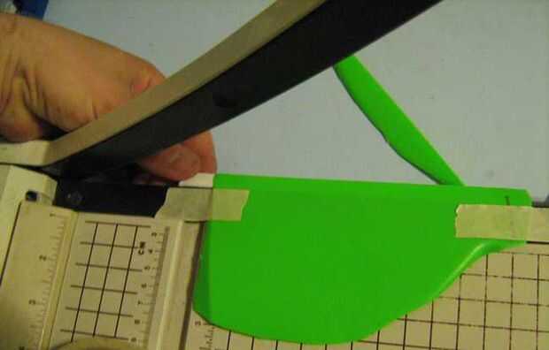 Para ello, utilicé un cortador de papel, con la barra de seguridad eliminada. Para obtener un ancho de franja uniforme, usé una plantilla para comprobar si la tira extendida igualmente sobre los extremos de la cuchilla de corte. Debido a su grosor, polietileno de alta densidad tiende a deslizar hacia fuera cuando se corta. Para evitar esto, se tomaron las siguientes medidas: