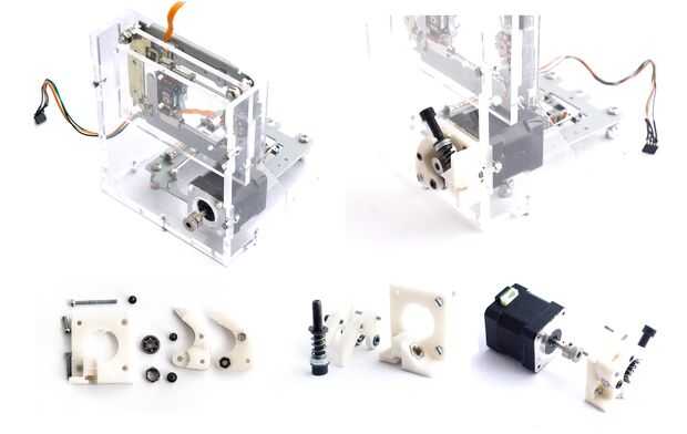 La unidad de filamento se compone de un motor de pasos NEMA 17 y un engranaje MK7 y MK8-tipo que tendrás que comprar. También tienes 3D imprimir las partes de la extrusora de accionamiento directo, que puede descargar aquí.