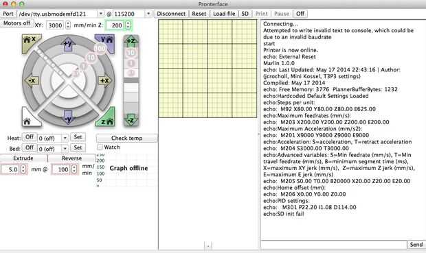 Tirada abierta, compruebe que el puerto y velocidad (baudios 250000) se establecen correctamente, haga clic en conectar. Usted debe obtener una pantalla similar a esta (init error de SD es un mensaje de error correcto que no conecte una tarjeta SD):