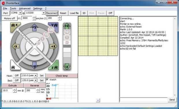 Convertir un diseño en Gcodes para imprimir usando una utilidad como Cura o Slic3r está también fuera de nuestro alcance, pero está bien documentado en los respectivos sitios web, y proporcionar archivos de configuración para satisfacer la curiosidad. Opcional pero sin duda útil para la calibración es el programa de comunicación de tirada/Pronterface que usted tendrá que instalar para iniciar la puesta en marcha y pruebas de su curiosidad. Versiones de Mac OS X y Linux también están disponibles para descargar.