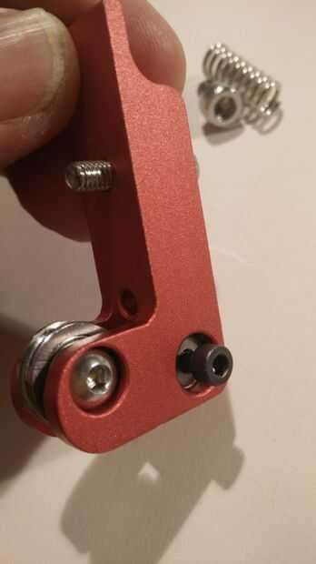 Ahora añadir el tornillo M5x8 para el resorte y empuje entre la pieza de metal negro y la palanca roja.