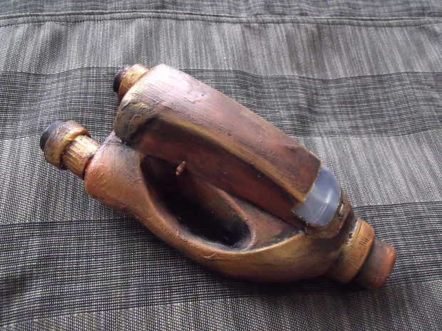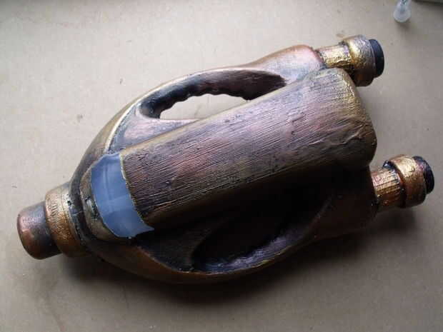 Poner un trozo de cinta adhesiva en la que desea una (o más) ventanas. La arena la botella con papel de lija, poner una capa de base en la nave espacial entera (yo uso pasta de modelado acrílico). Entonces las bragas todo negro. Después de secar el cepillo ligeramente con brown. Que el canal negro brillo. Acentuar los bordes con un pincel casi seco con un poco de pintura de cobre. Establecer algunas marcas de oro más fuerte alrededor de motores, la fronda y el borde de la ventana.