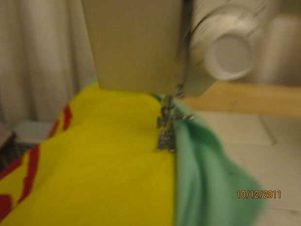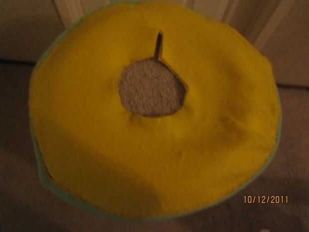 Coser el "barril" en el aro superior. Coloque a la tela amarilla sobre el aro superior con superposición de una pulgada. El lodo verde debe estar en el borde del aro. Levante el lodo verde y la superposición de tela amarilla en lugar del perno. Coser cuidadosamente la tela amarilla bajo el lodo verde alrededor del aro para que la costura no aparece. Es un poco complicado.