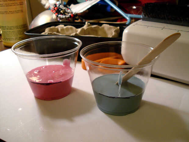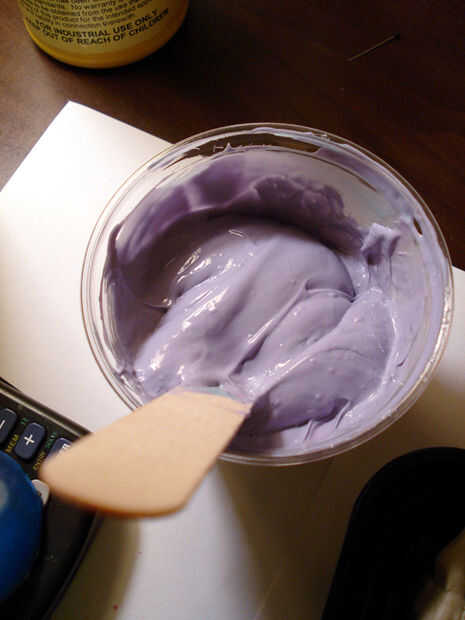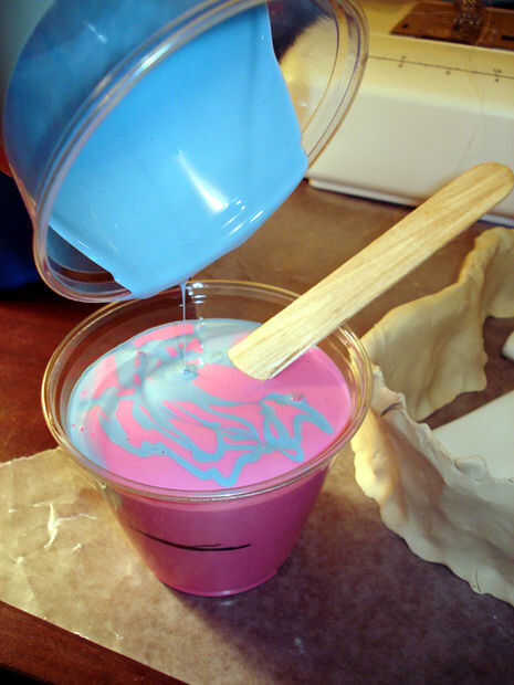 Tiempo para mezclar la goma! OOMOO 25 tiene una proporción de 1:1, así que usted debe mezclar partes iguales de azules y rosas. Cambiará a un color púrpura.