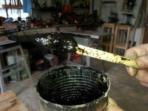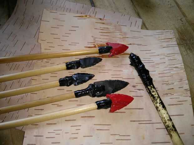 Muchos artesanos de paleo se saben que utilizan resina de pino en sus obras, y funciona bastante bien, pero hay algunas serias ventajas al uso de abedul. Para empezar no necesita ser utilizado únicamente como una goma. El alquitrán de pino debe reducirse a fuego hasta que se convierte en una goma y se trabaja mucho como masilla. Alquitrán de abedul, por el contrario, puede dejarse como un jarabe, aplicado como un pegamento líquido y deje para establecer como se evapora lo natural 'trementina', aunque pueden tomar una semana o más para hacerlo. Tiene un punto de ebullición más alto que hace de alquitrán de pino, y por lo puntos de la flecha y la lanza eran menos propensos a aflojarse en días muy calurosos, pero sobre todo, no ser frágil como el alquitrán de pino y conserva cierta flexibilidad.