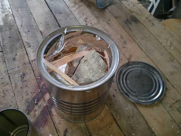 Para empezar, necesitarás cortar una 'X' en la parte inferior de la lata de galón y doblar los puntos de la misma hacia afuera. Esto proporciona una salida para el alquitrán gotee en el recipiente inferior. A continuación, usted querrá perforar un pequeño agujero en la tapa, aproximadamente 1/8" ancho. Esto es para ventilar los gases inflamables que se acumulan en la lata. Curiosamente, estos gases se pueden utilizar realmente para alimentar pequeños motores en forma de un gasificador de madera, pero esa es otra instructable totalmente. Por último, es necesario rellenar su puede con corteza de abedul. Recomiendo lo capas y enrollado como un periódico antes de ponerselo ya que permitirá su tar gotee en la parte inferior más libremente.