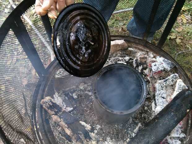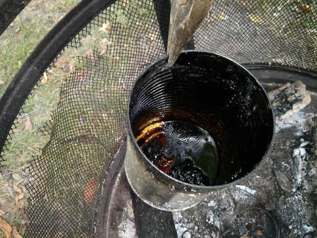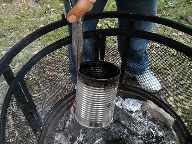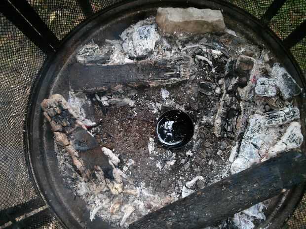 Cuando se agota su corteza, puede comenzar a alejarse del fuego y reclamar su envase de cuarto de galón. Recomiendo esperar 20-30 minutos para que se enfríe, sin embargo si eres impaciente, como yo, puede utilizar un par de pinzas para agarrar.