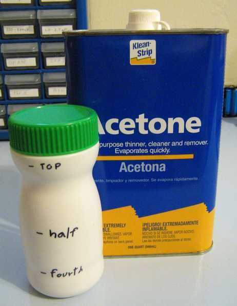 Añadir acetona a la savia recogida / echada que se llena el recipiente a medio camino. Después, agitarlo en incrementos de 15 minutos para ayudar a disolver trozos grandes. Es imposible disolver todos los trozos, ya que algunos son muy gruesas o se componen de virutas de madera así que Compruebe la consistencia periódicamente. Cuando esté satisfecho con los resultados, continuar al paso siguiente.