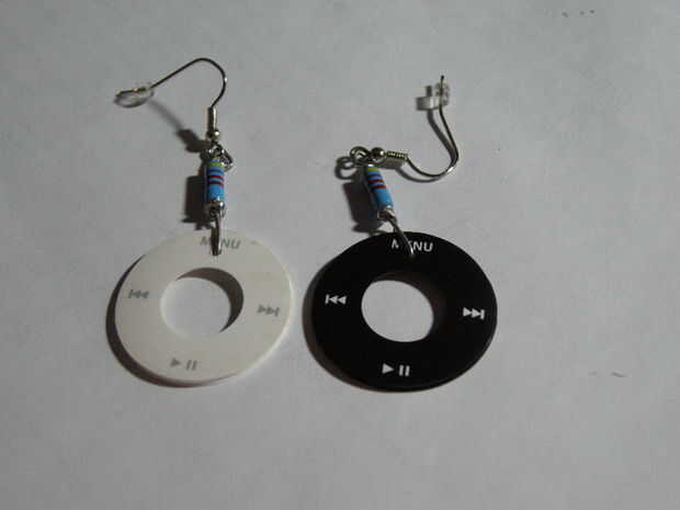 Siendo el estudiante de ingeniería eléctrica que soy, no había manera que estos iban a ser tus pendientes joya falsa diario montado. Tuve que dar mi toque. Mi primera idea fue utilizar sólo algunas resistencias como granos. Honestamente la única razón que yo no lo era porque no tenía suficientes resistencias que eran de un color verde oscuro más interesante. Así que tuve que idear una nueva idea. Había visto algunas fotos de pequeñas placas de circuito en pendientes. Pensé que era una gran idea, así que empecé a cavar en mi dibuja para algunos. Todo lo que pude encontrar fue algunos nanos de ipod roto que tenía circuitos muy fuerte. No tener ninguna manera de moler, esto era un no go. Luego vi las ruedas click y listo.