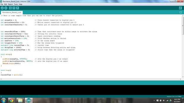 int alarmPin = 2; Zumbador piezoeléctrico conectado al pin digital 2 int motionSensorPin = 13; Sensor de movimiento conectado al pin digital 13 int resistanceSensorPin = 5; Pasador central de resistencias conectado al pin 5 de analot