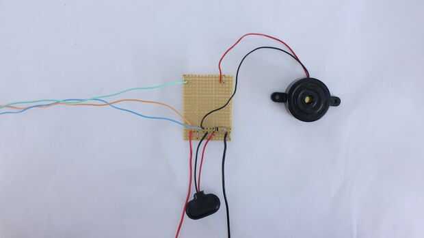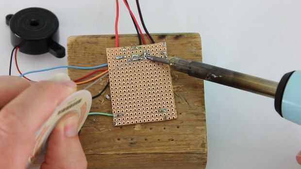 Luego suelde los cables de puente, el conector de la batería de 9 voltios, el timbre y una de las resistencias. En lugar de la segunda resistencia, añadir dos más puente los cables que se conectarán a los bornes en la caja.