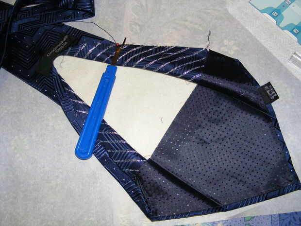 Hora de empezar a diseccionar el empate. Utilizar costuras ya que es casi tan bueno como un bisturí en trabajar con material delicado lazo. Bueno, tenemos poliester real aquí en lugar de seda.