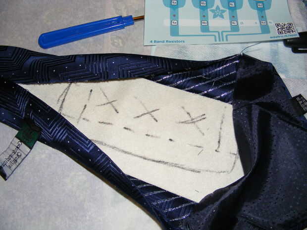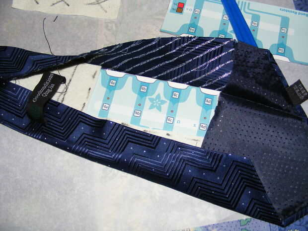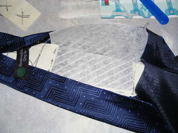 Tenemos que recuperar estructura el lazo aplicando un trozo de entretela fusible tejido exterior el lazo de donde la entretela corbata original ha sido eliminada. Esto también refuerza al tejido de la corbata así que podemos cortar hacia fuera las ventanas para los valores de color y número. Además, se insertarán los sujetadores de papel por ahí.