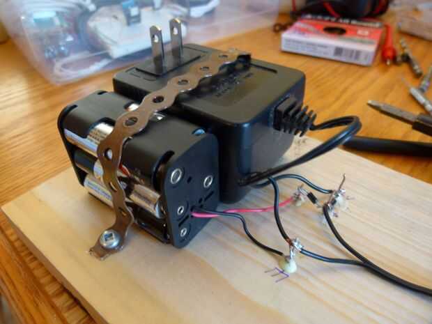 Uno de los cuatro postes es el post de la tierra. Soldar el cable negro de la caja a él. Un cable del par de cables de la fuente está marcado con una raya blanca, o línea punteada blanca o a veces unas crestas. Es el positivo. (Usted también puede probar con un medidor. Había soldado el cable negativo (el uno sin la raya) al suelo, así. Yo entonces soldar el cable negro del enchufe para el arduino (que yo había huyó de la verruga de la pared) en el negativo también.