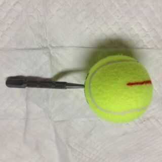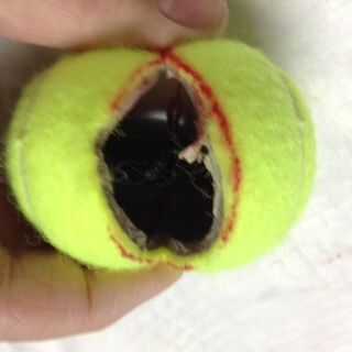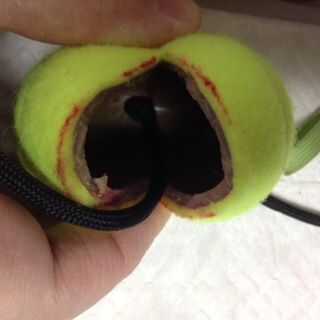 Marca de la pelota de tenis con una línea recta de lado al lado opuesto. Utiliza el Cúter para cortar la pelota de tenis, así que tiene una abertura cuando se aprieta los lados. Utiliza el Cúter para iniciar un pequeño agujero en el centro del lado de la bola enfrente de la abertura. Use el punzón para empujar el extremo de Nylon tipo III a través de la bola y a través de la abertura de la hendidura. Atar un nudo para evitar que se deslice de la pelota de tenis.