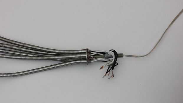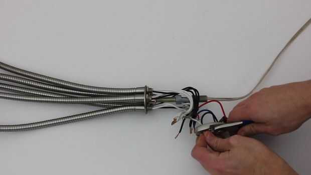 Separe todos los cables. Retire el interruptor de encendido. Luego saque el cable de alimentación principal a través de la parte inferior del soporte.