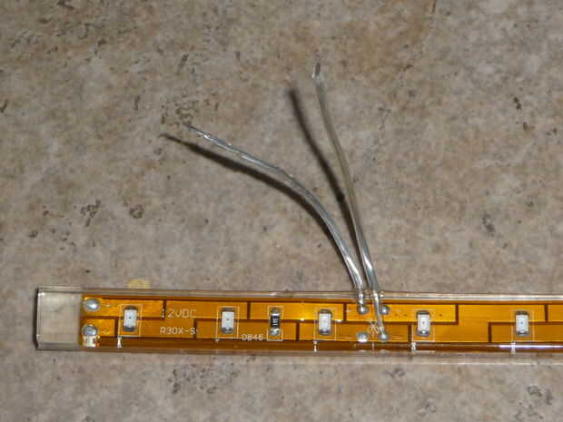 Después de cortar en una de las líneas de corte designado (si desea), corte los enchufes impermeables en el extremo de los cables. Separe los cables cortando entre ellos con un cuchillo de la manía. Entonces, les tira por lo que puede soldar directamente a los conductores. El cuadro demuestra exactamente donde debe estar en este momento. Tome nota de que es positivo y que es negativo en el PCB aunque la cubierta impermeable.