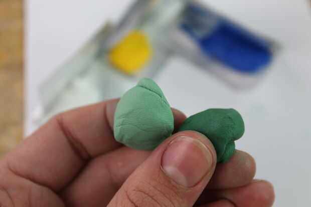 Mezclar un pedazo de amarillo y uno azul junto, les amasar juntos en los dedos para crear verde. Si el sugru se aferra a su uso de los dedos seco limpiar papel para limpiar las manos.