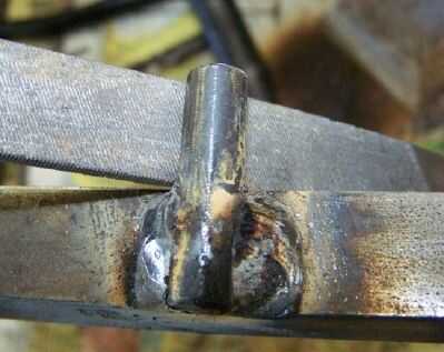 Cordón de soldadura se corra sobre el lado de la base de Cascanueces.  Esto interferirá con el ajuste y la función de Cascanueces.  Archivo o moler lejos cualquier material de soldadura que mantiene a los lados de ser suave y al ras.  Vestido el eje termina con una lima para quitar cualquier material de soldadura que no pertenece, también cualquier cuentas de salpicón que impiden que el eje es liso.  Esta foto es de un segundo eje en un paso posterior de suavizado.  Marcas azules al lado de sus medios de soldadura el metal llegó a ser suficientemente calientes para hacer una buena soldadura y buena penetración.