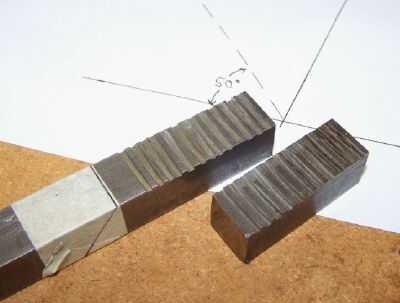 La primera mordaza está a la derecha en la foto.  Los dientes se han reducido en lo que será la segunda mordaza.  Cinta adhesiva marca donde será cortado del resto de la barra de acción.  La línea de corte es 2 pulgadas desde el extremo de la mandíbula.  El corte es en un ángulo de 50 grados.  Un corte de 50 grados biseca el ángulo de 100 grados de la segunda mandíbula fuera de la base del Cascanueces.