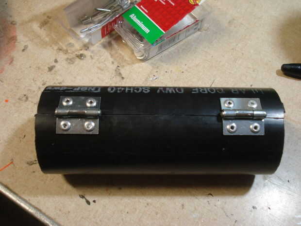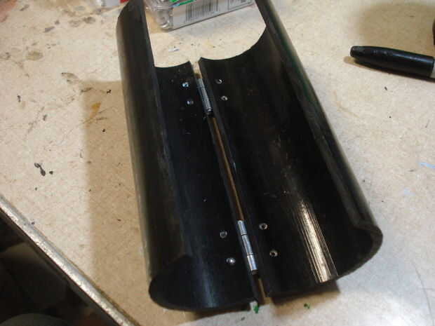 Cinta las dos cáscaras de nuevo juntos. Obtener sus bisagras y marca donde quiere ir y los agujeros en ellos. Retire la cinta y las bisagras, luego Taladre los orificios.