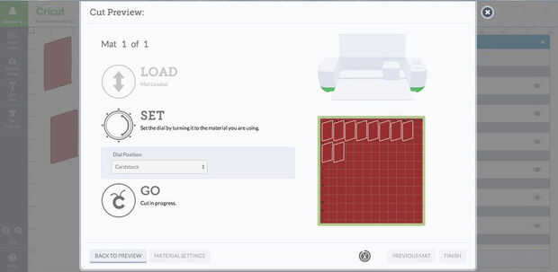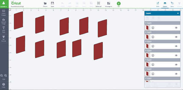 Para el corte, solo subir diez paralelogramos total (solamente--sin líneas de puntuación) en un nuevo archivo (dejar el archivo original solo por ahora) y pulse go, asegurándose de que la máquina Cricut está configurado y listo para cortar. ¿No entraré en que debido a diferentes máquinas son diferentes para la configuración, creo?