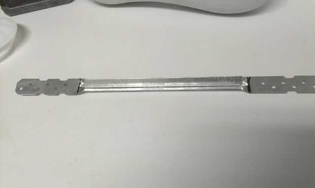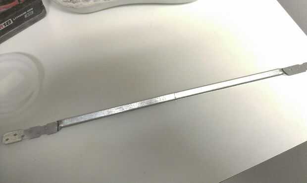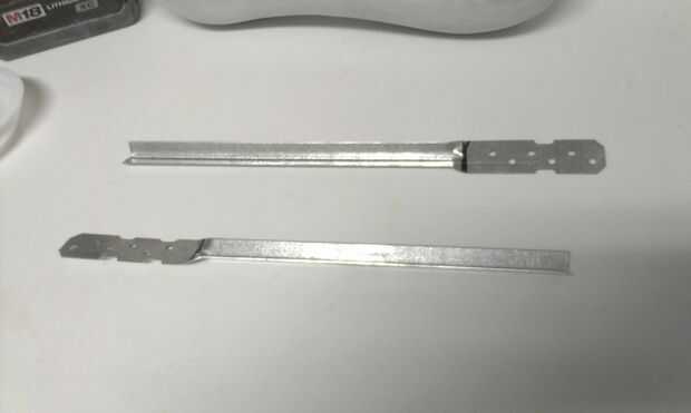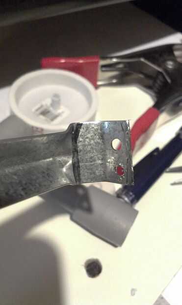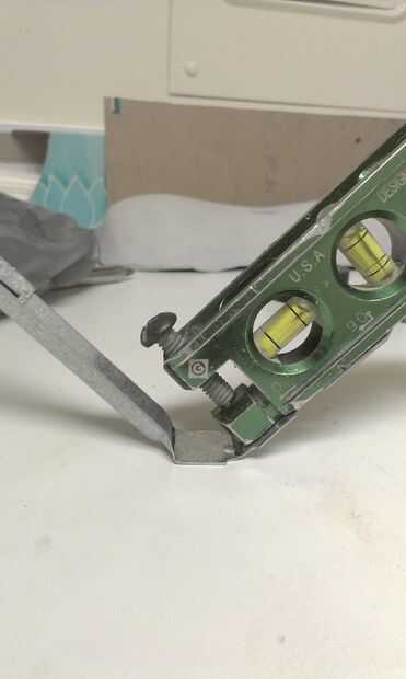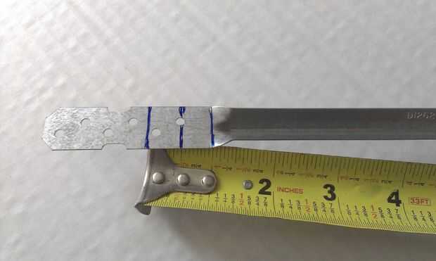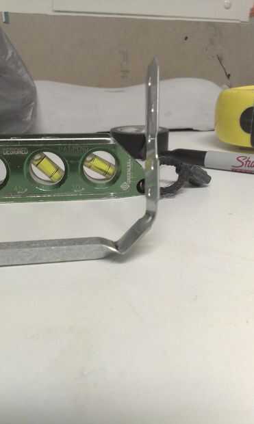 El metal clavado puente soporte del gancho agarrador y poner una línea a través en cada extremo, derecha donde la forma curva termina (véase cuadro 1). Medir 1/2" de la primera línea poner una 2 º marca en, y luego hacer un 3 º de línea a través de 1/2". Primero doblar el soporte 45 * en la primera línea, luego realizar un segundo 45 * doble en la segunda línea. Hacerlo a ambos lados. (véase el cuadro 2,3,4,5).