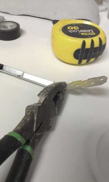 A continuación cortar el soporte a la mitad y lugar en la pieza encima de la otra y con cinta adhesiva, deberá medir 9" de lado a lado (ver imagen 6,7,8,9). Último haga dos orificios en ambos extremos de la abrazadera (Fig. 10,11) y corte el resto del extremo de la abrazadera en la línea 3 a través de él.