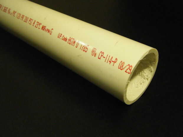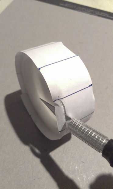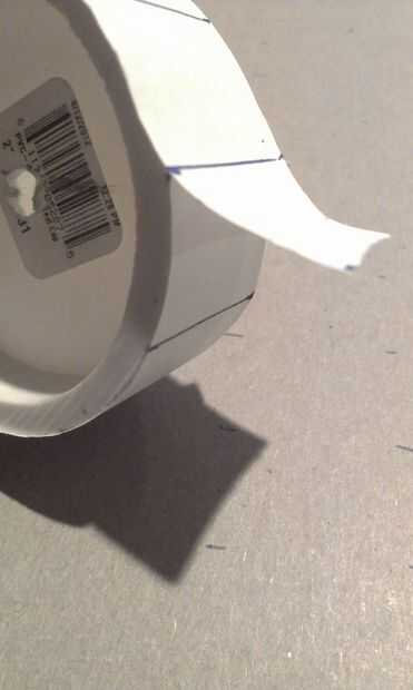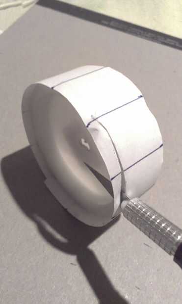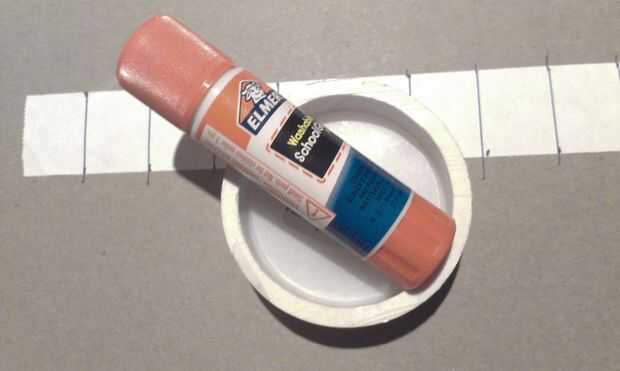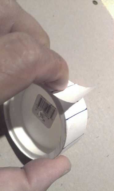 Saque largo 4 piezas, 8 1/2" de rollo de etiquetas y trace una línea a través de cada 3/4", deberás acabar con (11) secciones de 3/4 por pieza (ver Fig. 11,12,13). Ahora poner una capa ligera de pegamento stick en cada banda (voy a referir a la 2", 3/4" espesor tubería de PVC como las bandas de ahora en adelante) y abrigo de la etiqueta de 8 1/4" pieza en cada banda, terminan sobre el chapaleteo el último tramo en la primera de ellas ver foto 14,15,16). Coge el cuchillo y cortar la etiqueta lo más cerca posible al borde exterior de la banda (Fig. 17,18).