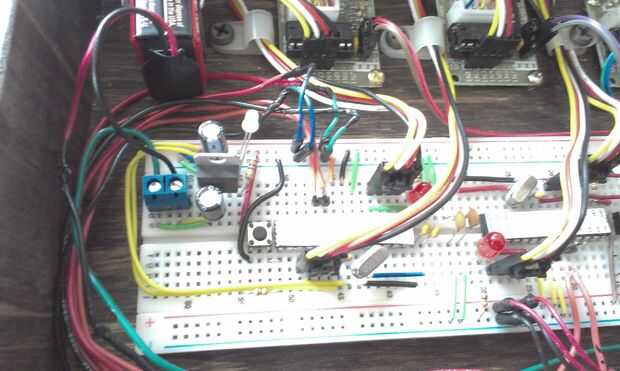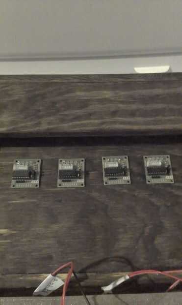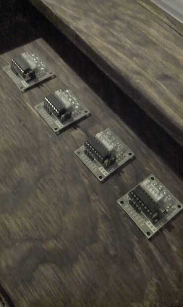 Recuerde que usted necesita construir 2 de estos. Una vez listo, comienza colocando a los controladores de motor paso a paso en la parte superior dentro de la caja en unos 2 1/4" de centro a centro entre sí). Atornillar las tablas del conductor abajo uno a cada lado enfrente de esquinas. (Fig. 1,2,3). Ahora coloque el tablero de pan con los Arduinos en él en la parte inferior izquierda de la caja, el 2 º pan y colocarlo en el nivel de esquina inferior de lado derecho con la primera tabla de pan. Pele apagado el forro papel de exponer el adhesivo en la parte posterior de los tableros de pan en lugar de hacia abajo y presionar en ella durante 2 minutos.