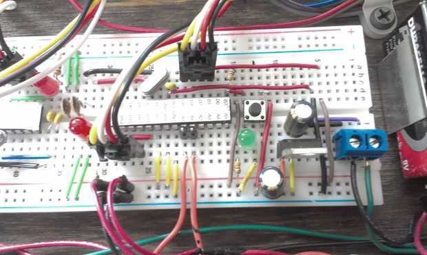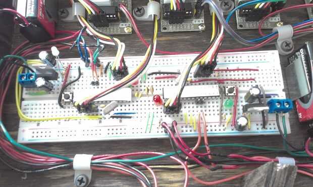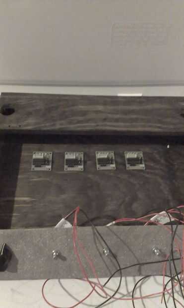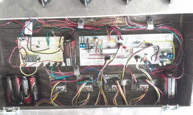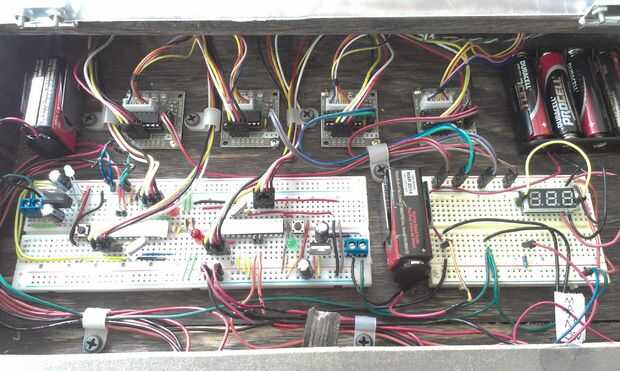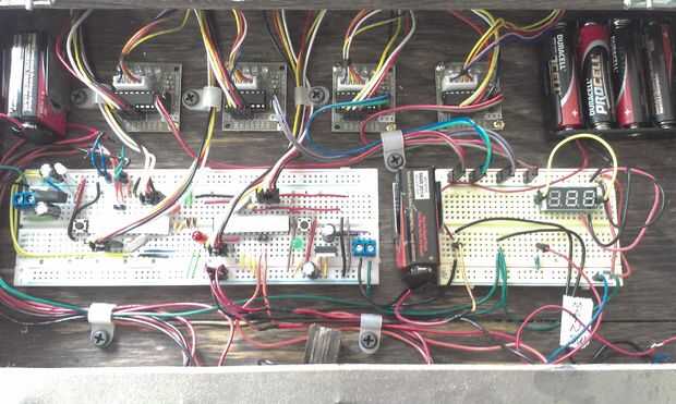 A continuación coloque el soporte de batería 9v uno en el lado izquierdo del tablero de pan izquierdo y coloca el sostenedor de batería de 9v otros entre ambas placas de pan. Les atornille. Y pasado de rosca el paquete de baterías AA en la esquina superior derecha de la caja. ver fotos de referencia.