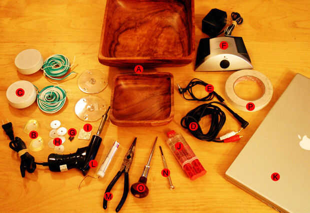 F) un amplificador: un amplificador de audio estéreo 8 ohms y al menos 15 vatios (así casi cualquier amplificador estéreo casero hará). Aquí he utilizado un amp clase D, que es lo suficientemente pequeño como para el transporte fácil.