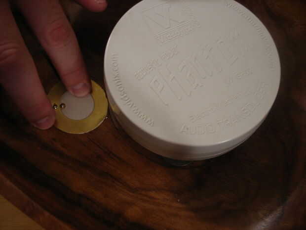 Pegar el piezo en la parte inferior del tazón de fuente más cercano al centro como sea posible sin tocar la placa de montaje. Asegúrese de que el piezo es firmemente contra el tazón de fuente, incluso si curva. Sostener o sujetar el piezo firmemente en su lugar hasta que el pegamento esté completamente seco.