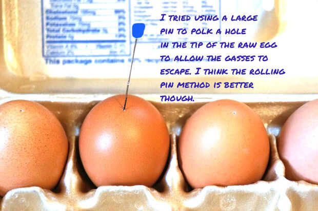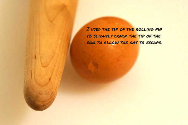 Toque en el redondo final del huevo con el rodillo o cuidadosamente haga un orificio en el señalado fin del huevo con un alfiler; con cuidado piercing solamente la cáscara y no las claras de huevo.