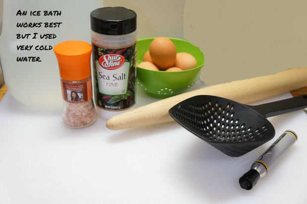 Para mi experimento había cocido 2 huevos a la vez, pero pensé de una manera más fácil de experimentar colocando el mismo número de tazones de fuente de agua helada que han hervido huevos, sobre una mesa o encimera. Use papel o fichas al número los tazones de fuente, así como retirar los huevos a diferentes tiempos puede mantener los huevos en el mismo orden como se cocinan.