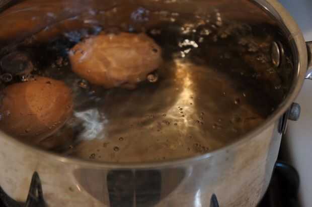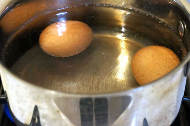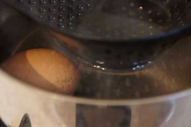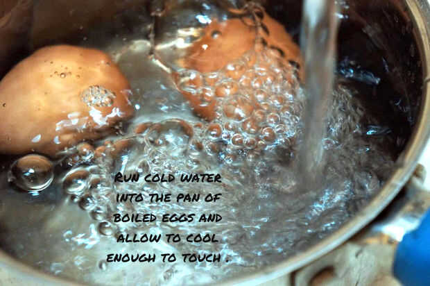 Usando una cuchara ranurada Retire un huevo en este momento y deje correr agua fría sobre el huevo se enfríe lo suficiente para manejar.