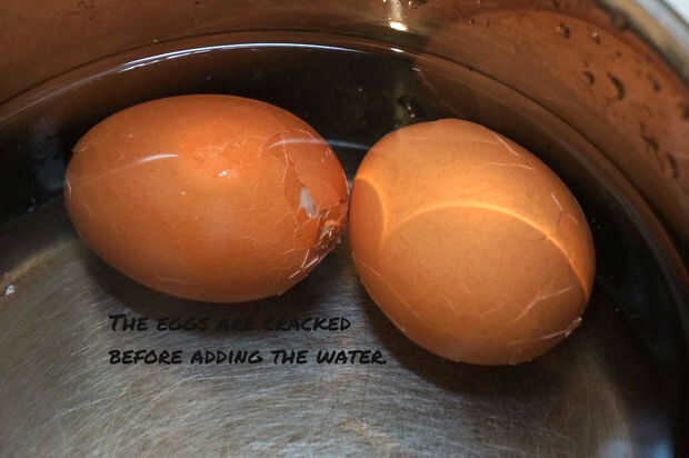 Puede utilizar una cuchara para romper los huevos ya que se eliminan de la bandeja antes de colocar los huevos en los tazones de fuente de agua con hielo. Esto ayudará a que el agua penetre el óvulo para pelar más fácil.