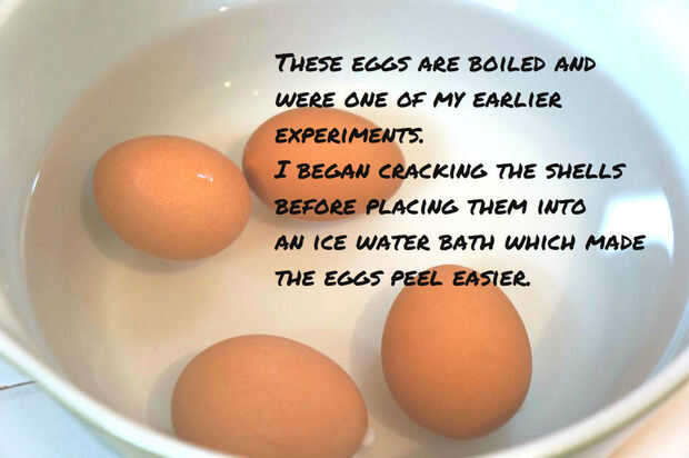 Pelar los huevos y colocarlos en un colador y enjuague con agua fría. me gusta que empiece a desprender los huevos en el extremo redondeado del huevo cocido como parece a la cáscara un poco más fácil de esa manera.