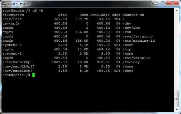 En la pantalla de imagen incluidos aquí, el porcentaje de espacio utilizado/dev/root, '/', partición muestra 78% en la línea superior. Cuando estaban ocurriendo los problemas de transferencia, ese porcentaje aparece como 100%.