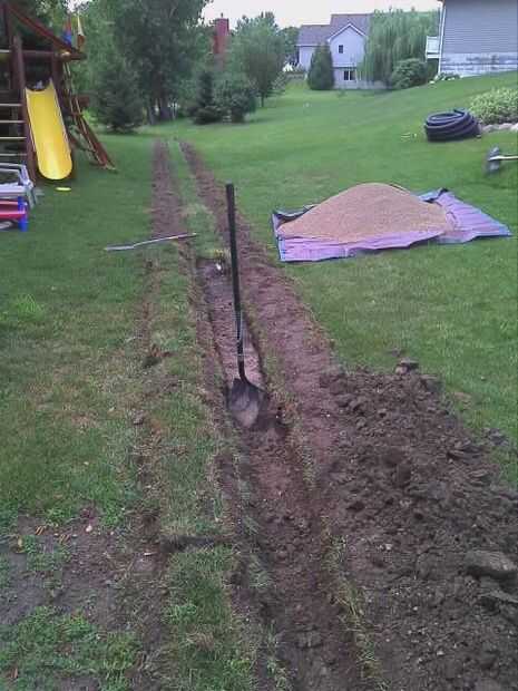 Luego utilizar una pala de trinchera (plana y estrecha) para cavar underneith sod y quitado en 3-4' secciones para substituir más adelante encima de la zona de baldosas.  Luego, usando una pala había cavado a mano el centro de la zanja y había colocada en un montículo que yo posteriormente retirada del sitio.