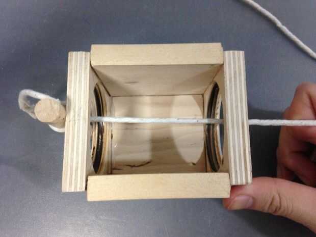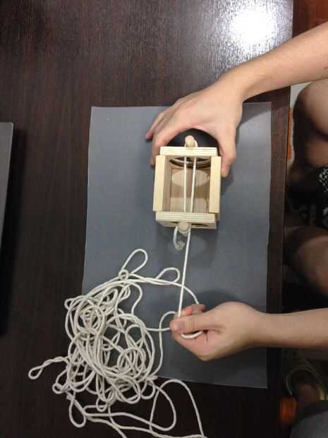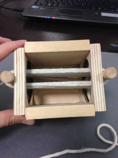 La longitud de la cuerda necesaria para pisar el resorte de torsión es muy larga. Una buena aproximación es de 6 a 8 veces la longitud de los brazos tendida de extremo a extremo, ya que envuelve el resorte de torsión doble para cada uno. Cualquier longitud que usted use, debe ser suficiente para envolver alrededor de los tacos de extremo a extremo al menos una vez.