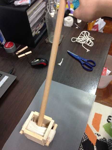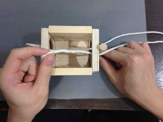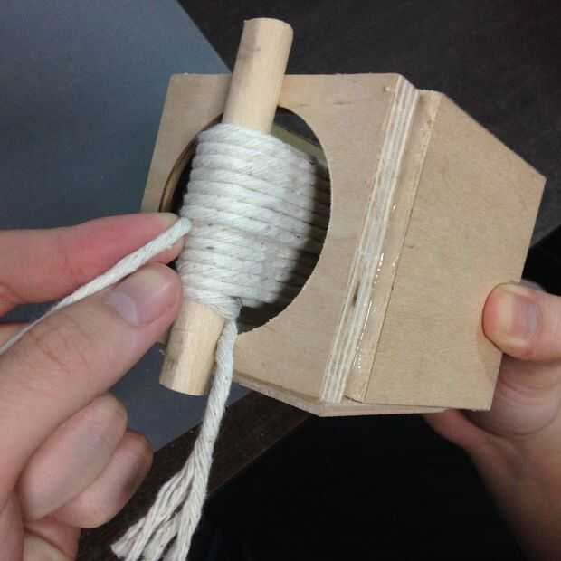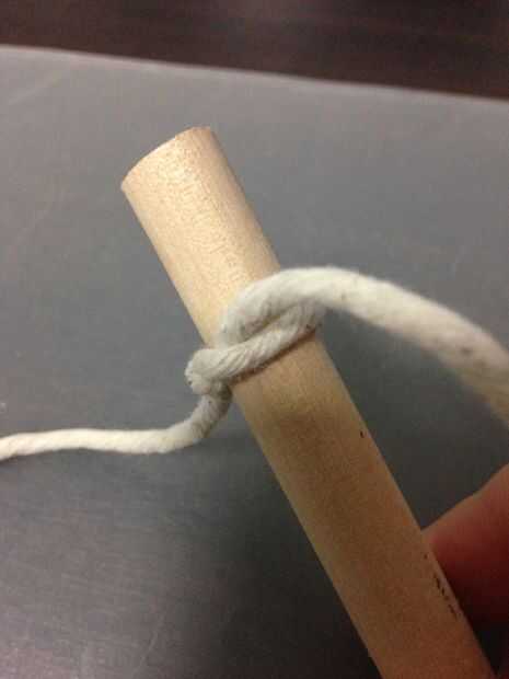 Amarre 1 extremo de la cuerda a una de las piezas de taco de 7cm. Yo sugeriría para asegurarse de que la cuerda no se mueva mientras aprieta el resorte de torsión o tejer cordeles, archivo un pequeño hoyo en la espiga alrededor de 2,5 cm de los extremos de la espiga. Atar firmemente la cuerda en el hoyo y la cadena no debe cambiar de ese hoyo, otra vez en el otro extremo de las espigas una vez que haya terminado de tejer la cadena a su alrededor