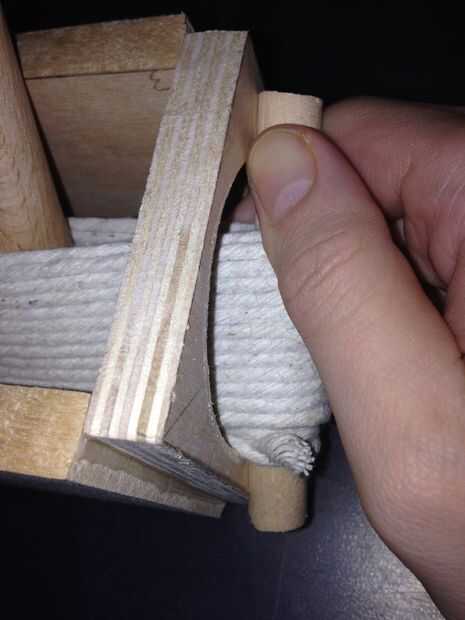 Como se muestra en las fotos, con los tacos colocados en los orificios de cada lado de la estructura de resorte de torsión, tire de la cuerda hacia fuera a lo largo del mismo lado de los tacos como va. Vaya alrededor de la espiga y tirar el pase de guita y por el otro lado de los tacos. Tire la cuerda firmemente contra los tacos después de cada pasada y sostenga la cadena apretada como usted pisada la cuerda otra vez. Repita el proceso de la envoltura de la cuerda va hacia abajo la longitud de la espiga y alcanza el otro hoyo que usted presentó. En este punto, puede detener, ate el extremo y cortar el exceso, o puede tejer otra vez la cuerda alrededor de una segunda capa de la cadena de envolver. Esto aumentaría la fuerza del resorte de torsión. Para ello, se superponen el aguijón sobre la capa anterior de cuerdas y dar la vuelta para otra ronda de extremo a extremo.