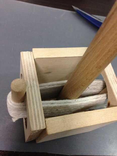 Insertar a lo 50cm largo grueso pasador de madera en el hueco entre las cuerdas en posición vertical como los brazos del arco. Comenzó a torcer los tacos cortos del muelle de torsión en el mismo sentido y cantidad. Las cuerdas aplicarán la presión en los brazos del arco y se inclinará hacia un lado, parecen finalmente en el primer cuadro de conjunto de imágenes de este paso. Este paso es muy difícil y requerirá algunos lucha libre de su parte para presionar y mover el pasador para aumentar la tensión. Si realmente no se puede mover más los tacos más a su posición, puede tratar de conseguir el resorte de torsión, y utilice un martillo para golpear en el lugar.