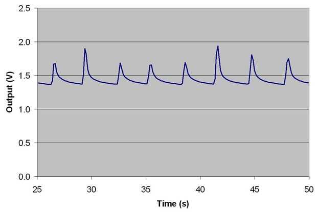 Había atado en esta monstruosidad y me enganchó hasta mi caja de adquisición de datos de confianza de DataQ. Adjunta es la tensión de salida de parcela del generador antes de Step-up conversión al USB de 5V. Básicamente la batería ejecuta el paso convertidor y el generador de aire carga la batería. En el diagrama puede ver el efecto de nivelación de la batería, con los picos de voltaje cuando yo estaba respirando. Realmente estaba acercando a hiperventilación, pero en nombre de la ciencia. Los resultados pueden verse en la foto de la carga del teléfono. Una cosa a mencionar es que tuve que modificar un cable USB para el RAZR a cargo tal como se detalla en este sitio web. No tengo números sólidos sobre el poder que estaba generando, no he subido con una buena forma de medir eso todavía.