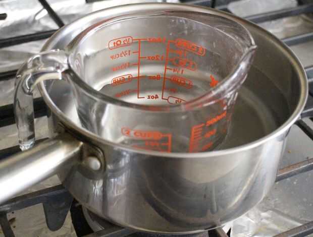 No tengo una caldera de doble real, así que utilicé un vaso de medir (taza pyrex) y colgó su mango sobre el borde de una cacerola. Llené la olla con aproximadamente 3 pulgadas de agua.