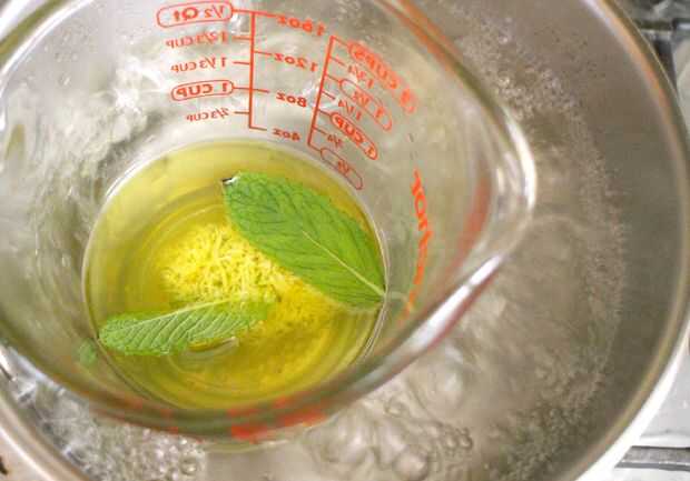 Una vez que se haya disuelto el aceite de coco y cera de abejas, agregar en cualquier aceites esenciales te gusta, y luego un par de menta hojas. Permiten hojas empapar más para un sabor más fuerte, si lo desea.