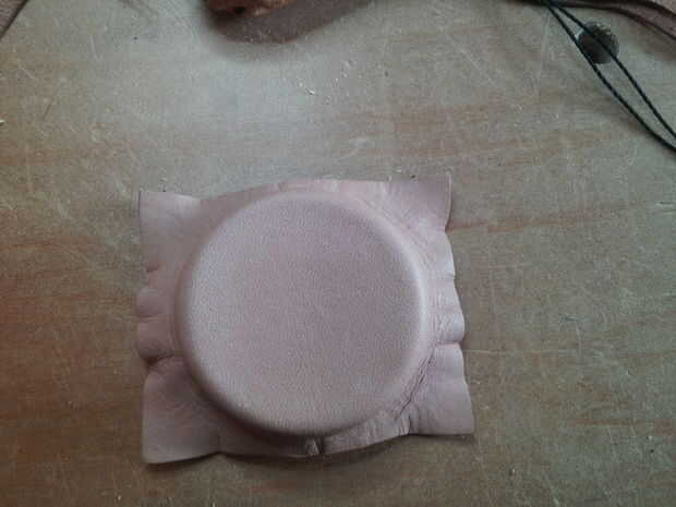 Tomar un cuadrado de 3" de cuero de 1-2 onzas de agua. Una vez que está completamente saturado, debe ser agradable y elástico. Estirar sobre un cilindro que es cerca de 1.5" de diámetro. Una botella de la píldora o la espiga son algunas opciones. Una vez que ya tienes se vea como la imagen de arriba, deje que se seque.