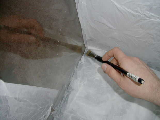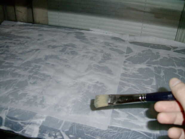 Vierta el pegamento mezcla / agua primero. Difundirla alrededor. Luego tirar el papel en la parte superior. Se absorben de la mezcla. golpee hacia abajo con el pincel. y capa de papel. Capa por lo menos 3 de estos. Utilice el cepillo para obtener en todos los rincones.