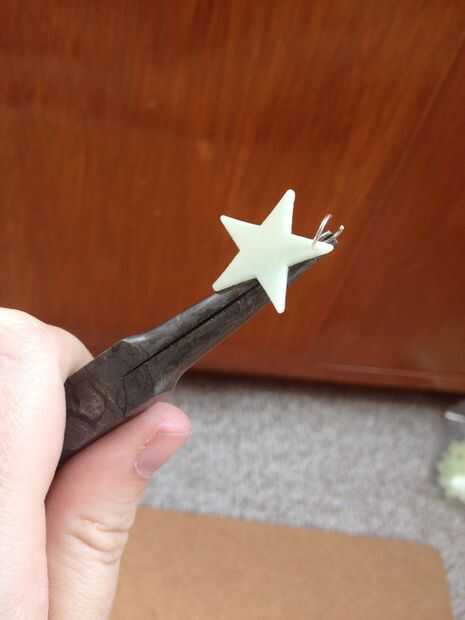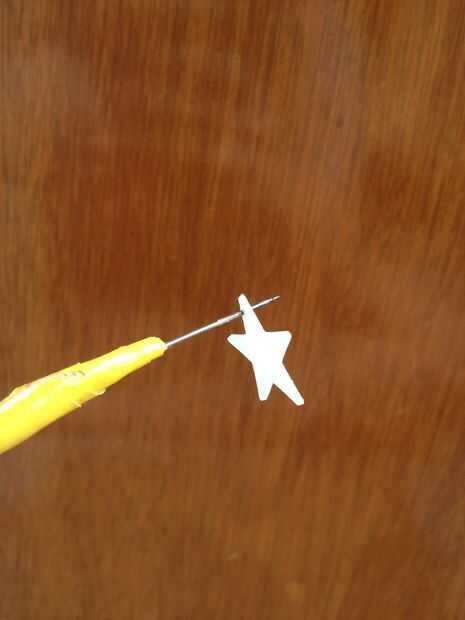 Calentar la aguja sobre la estufa o dejarlo fresco (dejándolo enfriar hace un poco más difícil de perforar el agujero y se corre el riesgo de romper el frente a la punta de sus estrellas). Suavemente empuje la aguja a través de la parte superior de tu estrella. Inserte un anillo del salto, asegúrese de que dejar el anillo del salto abierto (hará que adjuntarlos posteriormente ir mucho más rápido). Una vez que has preparado tus estrellas, ponerlas al lado.